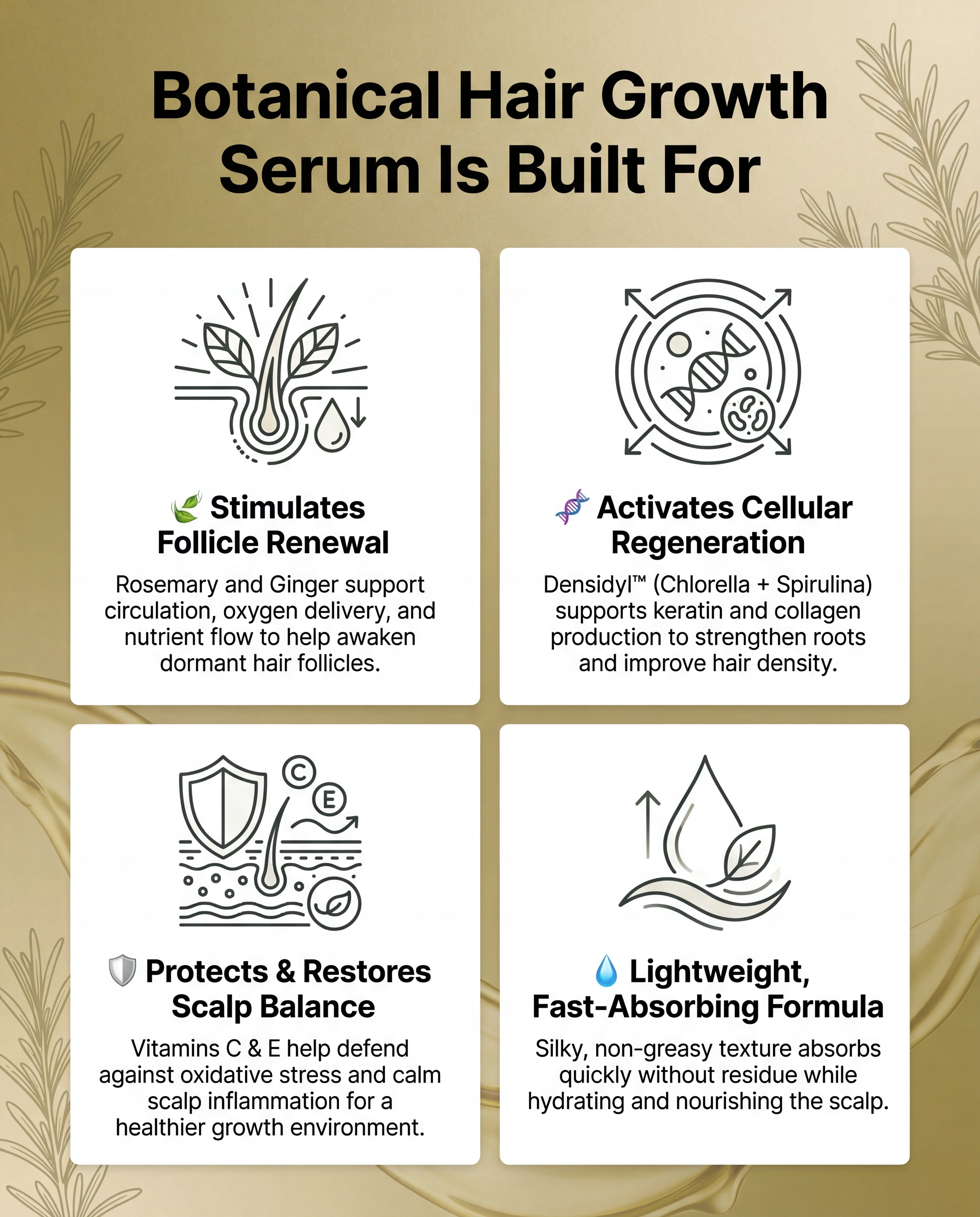 Formulated with clinically backed botanicals like Rosemary, Ginger, and Densidyl™ (Chlorella + Spirulina) to restore scalp health and support natural growth.